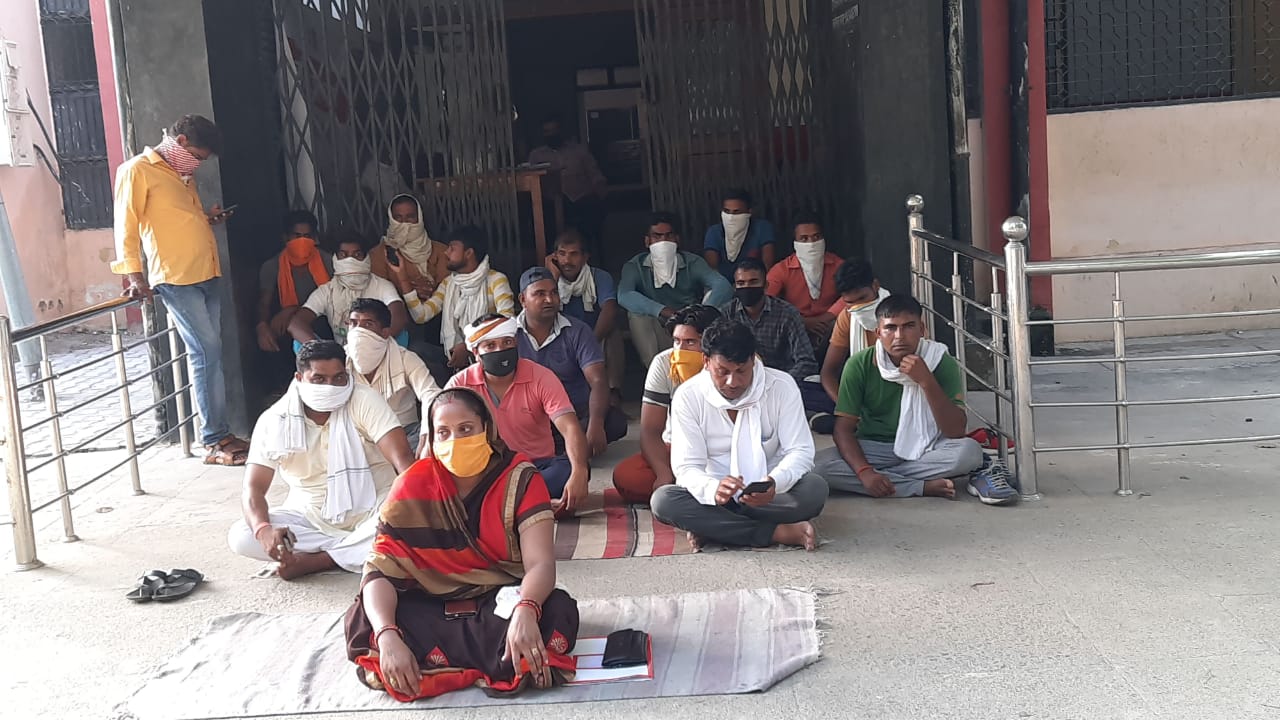 | धरने पर बैंठी भाजपा महिला मोर्चा की क्षेत्रीय उपाध्यक्ष दीपमाला संतोषी व कार्यकर्ता। |