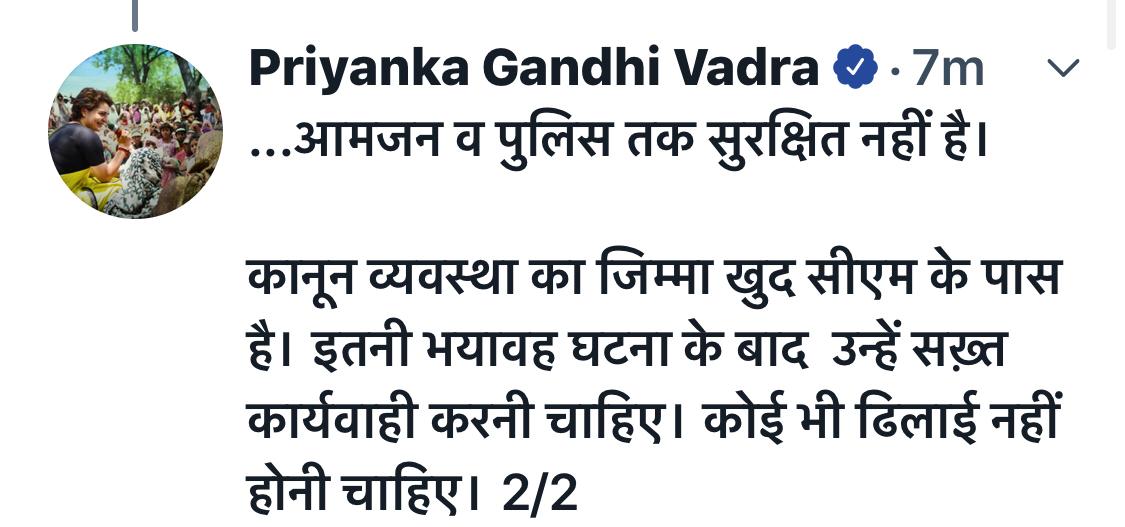 लखनऊ। कानपुर देहात में हुई घटना पर कांग्रेस महासचिव प्रियंका गांधी ने ट्वीट कर शहीद हुए पुलिसकर्मियों के प्रति संवेदना व्यक्त की है वहीं पर उन्होंने उत्तर प्रदेश सरकार पर करारा प्रहार करते हुए कहा है कि लॉ एंड ऑर्डर की जिम्मेदारी यानी कानून व्यवस्था की जिम्मेदारी खुद मुख्यमंत्री योगी आदित्यनाथ के पास है ऐसे में उत्तर प्रदेश में पुलिस कर्मियों पर सरेआम हो रही इस तरह की घटनाएं जिनमें उनकी जाने तक जा रही है इसके लिए जिम्मेदार कौन है? ऐसे में उत्तर प्रदेश पुलिस को और उत्तर प्रदेश के मुख्यमंत्री को कड़ी से कड़ी कार्यवाही करनी चाहिए।